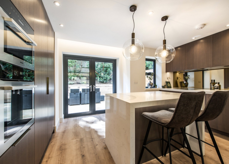 Each interior was designed with a beautiful bespoke kitchen/breakfast area finished in grey oak, classic quartz and bronze mirror splashbacks, complete with a central island and seating area with bi-fold doors leading out to the secluded rear patio and landscaped garden. A comprehensive lighting scheme was designed to enhance the overall look and feel of the properties.